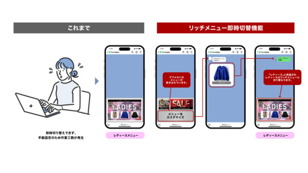 ユーザーの発話キーワード(例:「レディースメニューを選択」)から最適なリッチメニューへ自動切替。個別開発不要でパーソナルな顧客体験を提供し、顧客満足度向上とコンバージョン促進に貢献します。