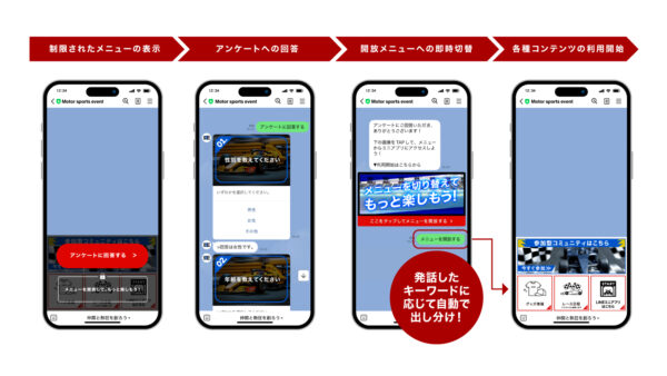 こうした状況に対し、トーチライトは同イベントのLINE公式アカウントにおけるファンの集約、データの一元管理、アンケート回答率向上に着目。「DialogOne®」の「レスポンシブリッチメニュー」を導入し、個別開発不要でリアルタイムなリッチメニュー変更を実現。ユーザーの行動に応じたメニュー切り替えにより、最適化された顧客体験を提供しました。
