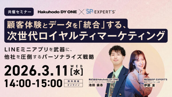 3月11日(水)に株式会社Hakuhodo DY ONEでは、株式会社SP EXPERT’Sと共催で、『顧客体験とデータを「統合」する、次世代ロイヤルティマーケティング〜LINEミニアプリを武器に、他社を圧倒するパーソナライズ戦略〜』と題したオンラインセミナーを開催いたします。